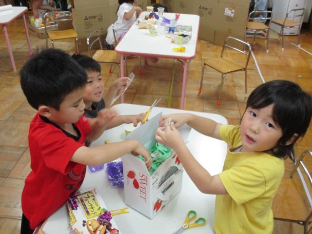 年長児ならではの友だちと協力して一つの物を完成させる!ゆり組の子ども達らしいアイディアやそれぞれの役割、友だちの意見も聞き入れながら作業をすることも少しずつ経験できるように…と願っているところです。