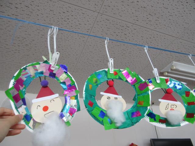 お部屋に出来上がった作品を飾っていると、「せんせい、おそとのほうむけて(かざって)」と。私は子どもたちに見えやすいように飾っていましたが、子どもたちはサンタさんに見せたかったようです♡