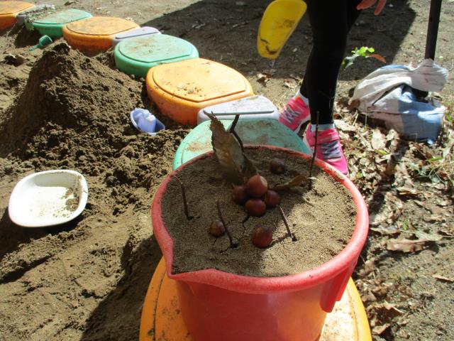 大きなどんぐりの実は、袋いっぱい拾ったり、フライパンに入れてお料理したりと、それぞれあそびを見つけて楽しんでいますよ。