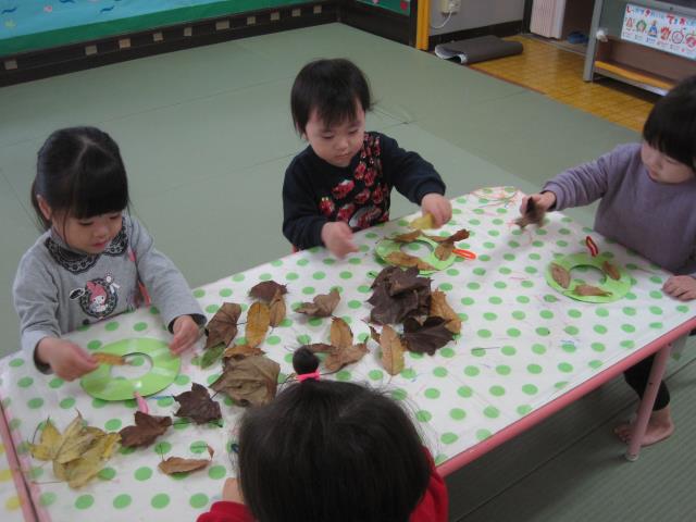 戸外遊びでは寒さを感じたりドングリ拾いや葉っぱの色が変わっていることに気づいたりし、秋の季節を感じながら楽しんでいます。また子どもたちが好きなブドウの製作を行なったりしました。