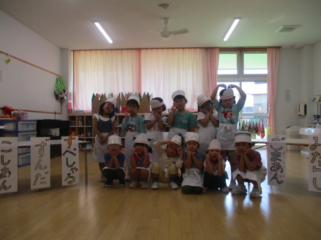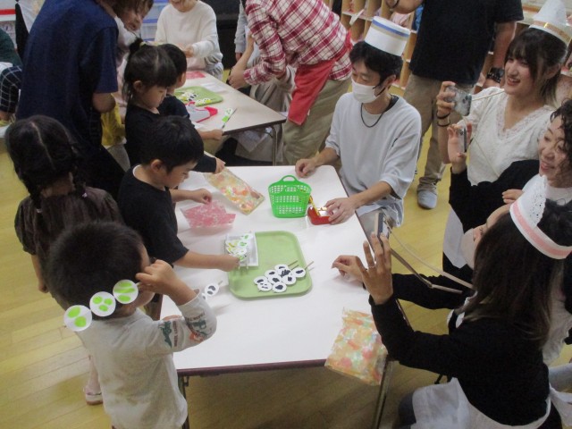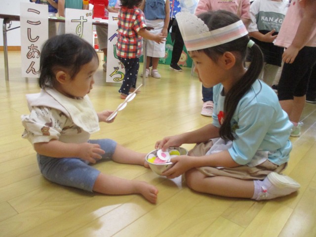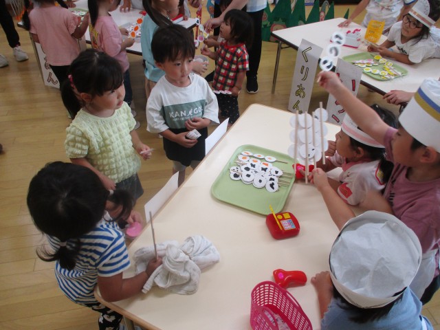 先日大成功に終わったおだんごやさんがまたオープンです♪ 準備OK、いざお客さんたちの入店です。引換券と好きなおだんごを交換します。店員さんになりきった子ども達のサービスが止まりませんでした(笑)その後はお家の方々と役を交換して楽しみました♪
