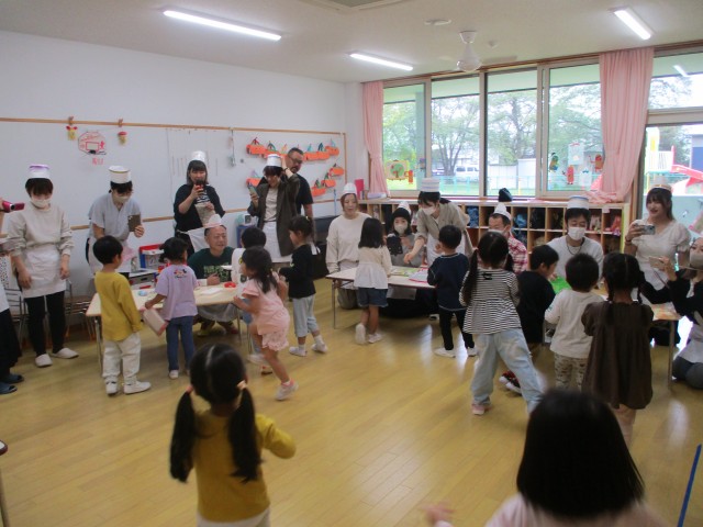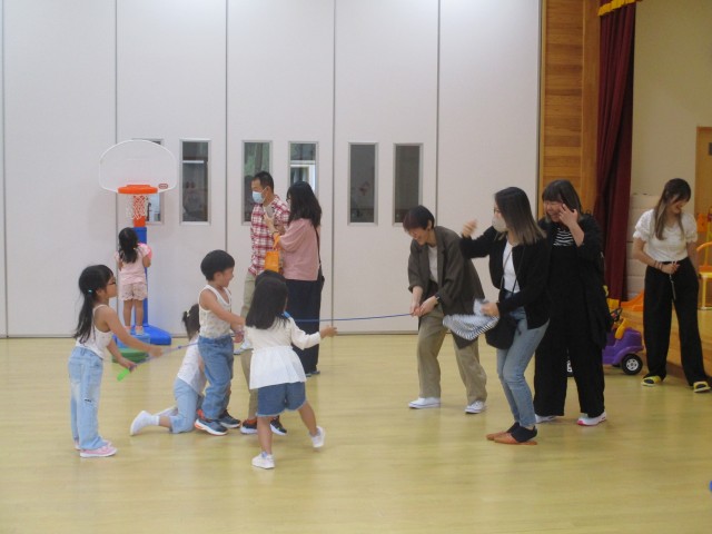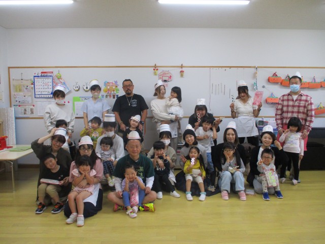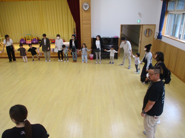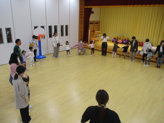 ゆうぎしつで体もたくさん動かしてお父さんお母さんとたっぷりふれ合いました!最後はみんなで大きな円になり、おかえりのごあいさつをしました。