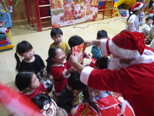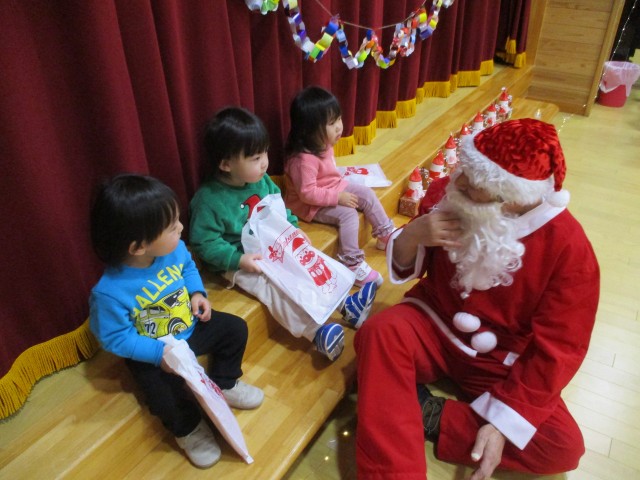 子どもたちがゆうぎ室に集まってからは、あちこちに装飾された各クラスのクリスマス製作を発表し、子どもたちはサンタさんを待ちました。