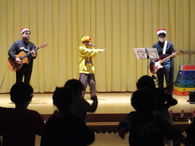 バンド活動をしている保護者の方を引き連れてきたサンタさん、ノリノリで子どもたちとふれ合ってくれました。